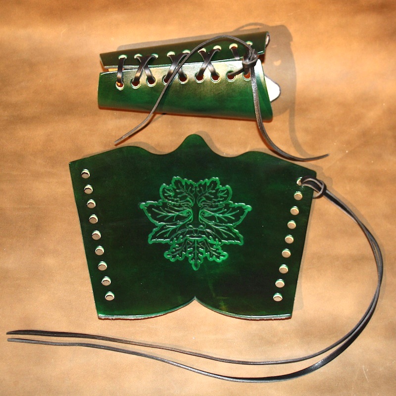 These hand made laced leather arm bracers are made from top quality 3-3.5mm vegetable tanned hide. They are made in my own workshop. The Green Man is deeply tooled into the leather then hand dyed and finished with a water resistant wax coat. Each bracer is supplied with a strong leather lace to fasten it.