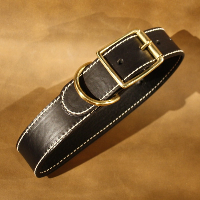 No complications here. This is a simple but elegant 1.5 inch wide dog collar hand made to fit a dog with a 16 to 20 inch neck. The collar is made in plain black leather.