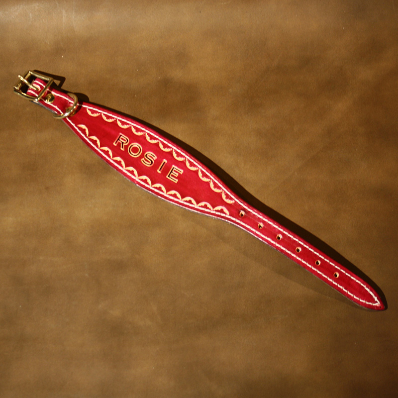 Red leather Greyhound or large lurcher collar. Individually made to order with your dog's name and border design embossed by hand.