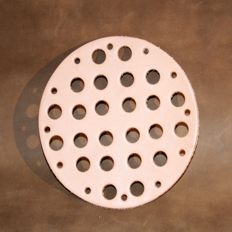 This is a 6.75 inch (17cm) diameter leather disk with 24 x 15mm holes for your arrows and more smaller holes round the edge to make it nice and easy to stitch into your arrow bag.