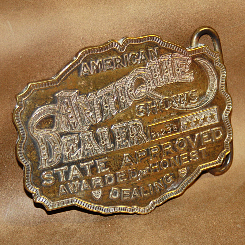 Minted Brass Buckle - American Antique Dealer State Approved For Honest Dealing - Stamped with 'Warranted Finest Minted Brass' and stamped with an Indian Head maker's mark - to fit 2.25" belt strap.